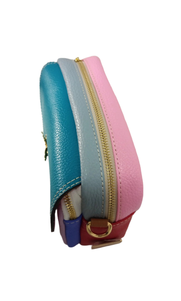 - Záródás: kör alakú fém cipzár + bőr fedél fémcsattal